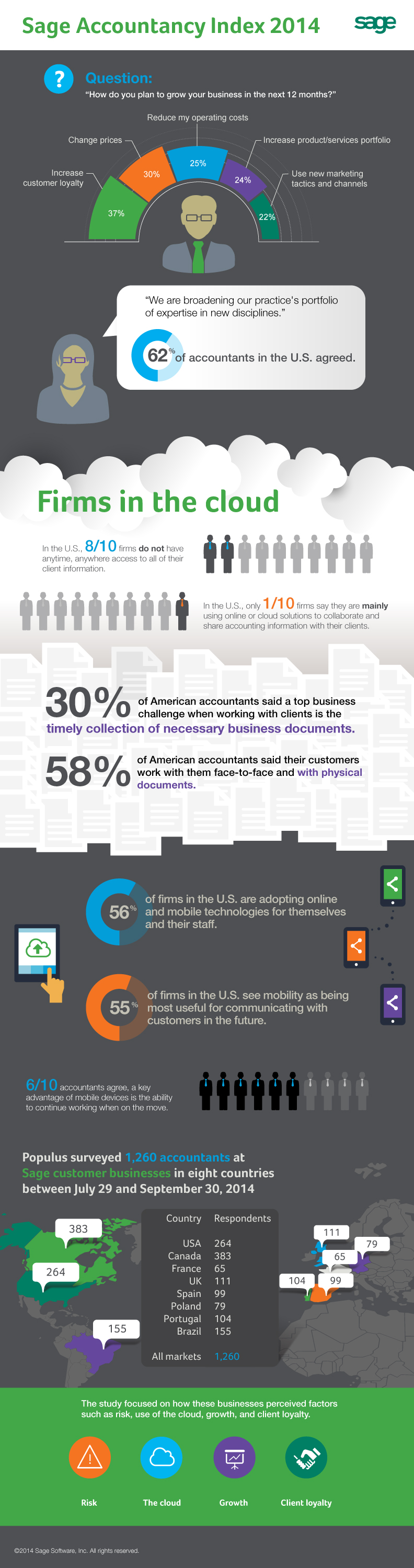 IRVINE, Calif. (December 9, 2014) – Sage North America, a leading provider of business management software and services to small and midsized businesses for more than 30 years, announced today the findings from the Sage Accountancy Index, a survey from The Sage Group plc. It was found that accountants in the U.S. are shifting their approach to business beyond traditional accounting to become the most trusted financial advisors for their clients. Sage surveyed more than 1,200 accountants throughout the world, including 264 in the U.S.